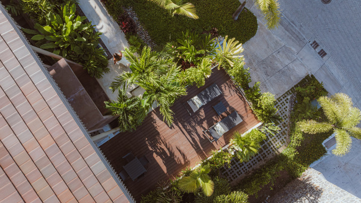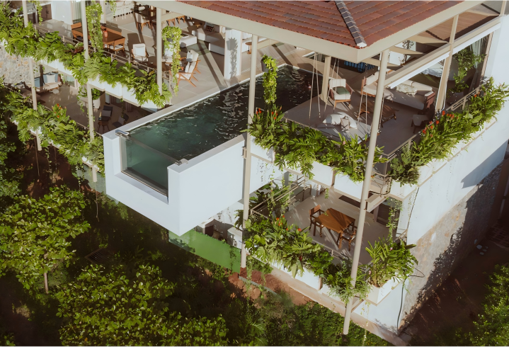 上层设计成为了一个轻盈、透明的平台,容纳了生活空间、种植阳台以及看似漂浮在树冠中的悬臂泳池。为了减少对环境的影响,天然石材和木材调节热量,而开口的布置则使得交叉通风成为可能,并控制太阳的照射,同时创造了沉浸在景观中的感觉。